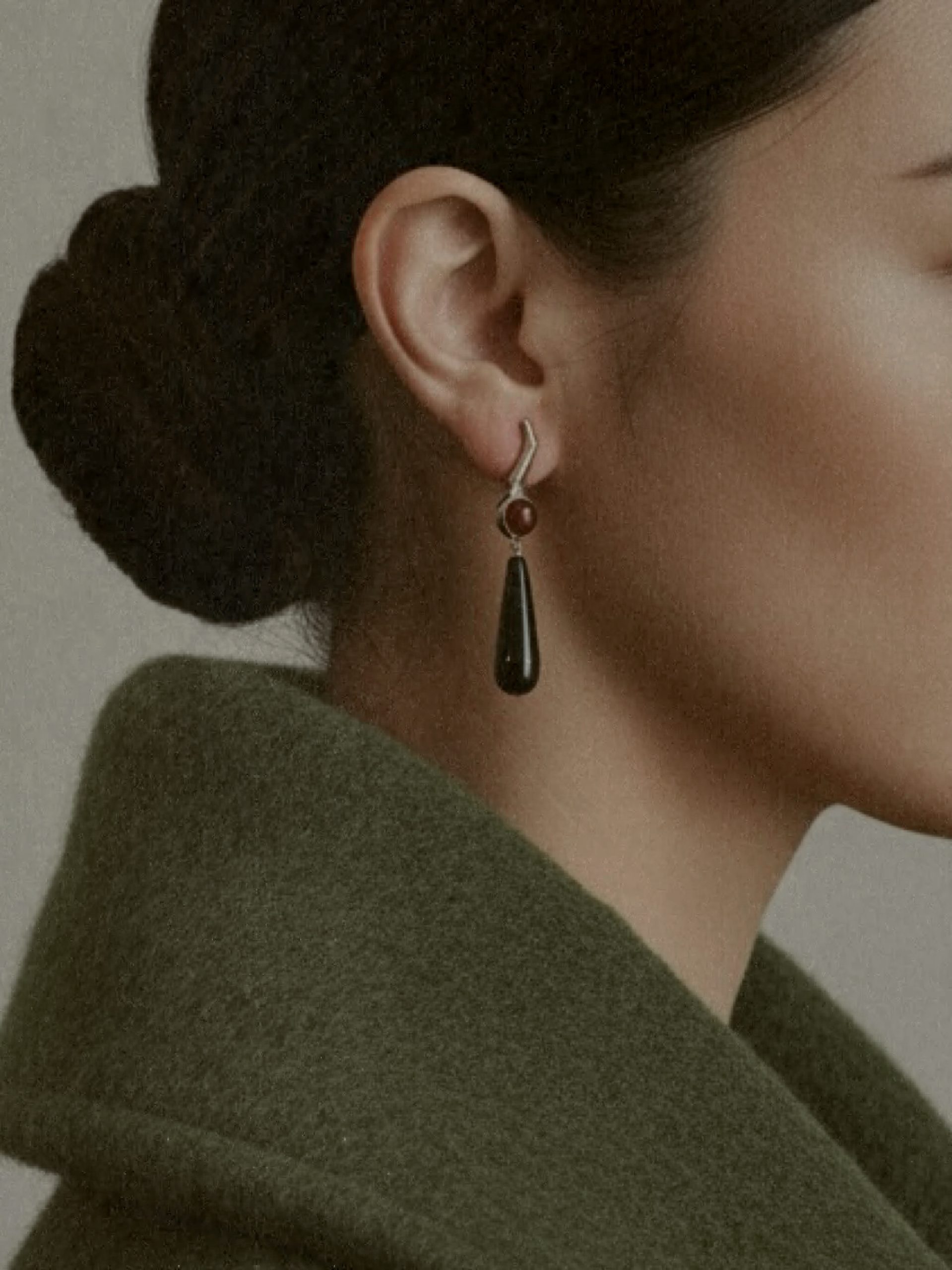 Bold and asymmetrical statement earrings celebrating contrast and natural imperfection. One side features a black agate drop paired with a setted carnelian, while the other is adorned with a large, uniquely shaped freshwater pearl. A striking balance of form, texture, and individuality.Crafted from recycled sterling silver.