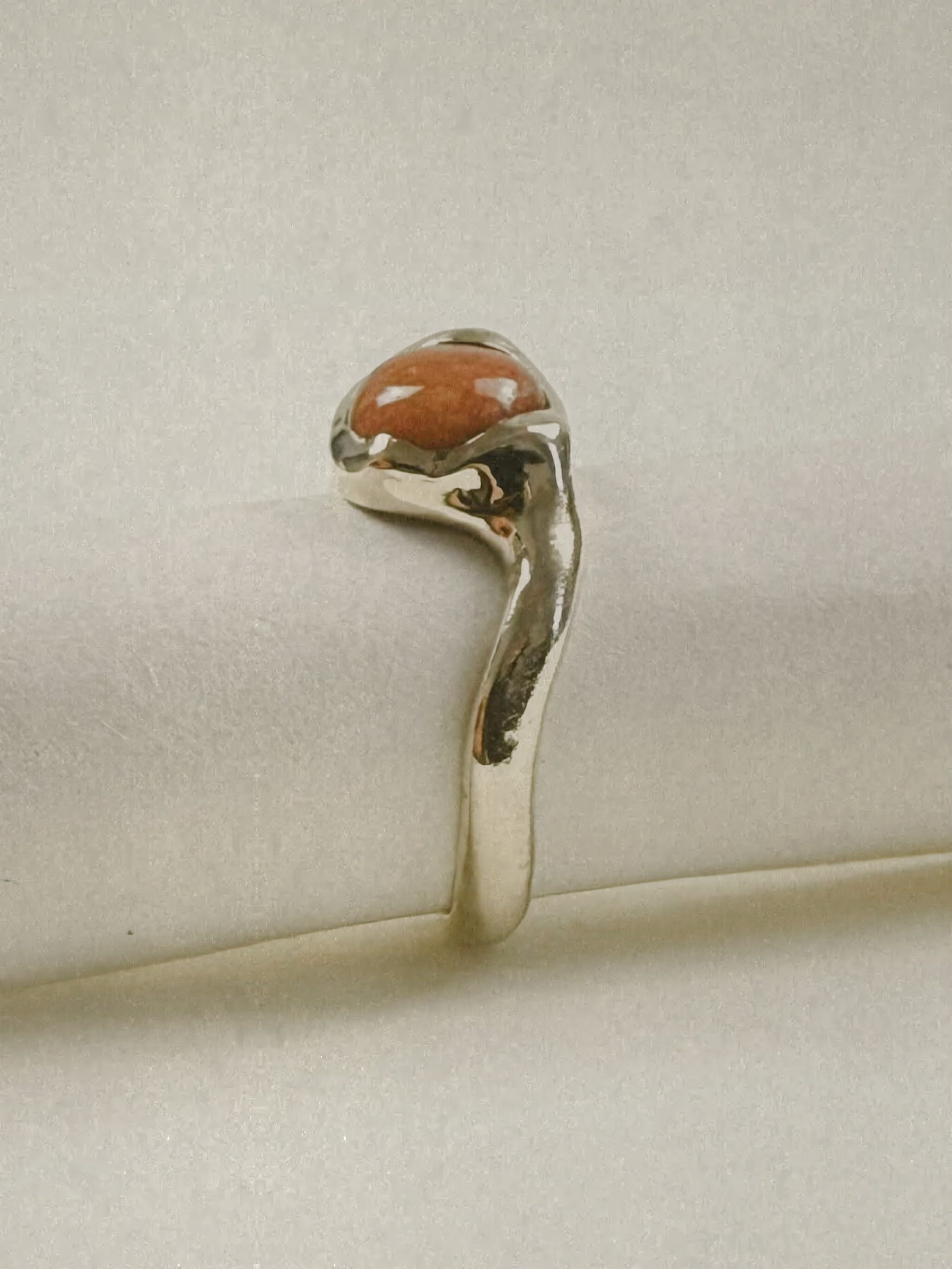 Handcrafted artisan ring featuring a red aventurine gemstone, inspired by wabi-sabi aesthetics. Minimal yet unique, with organic textures and subtle imperfections